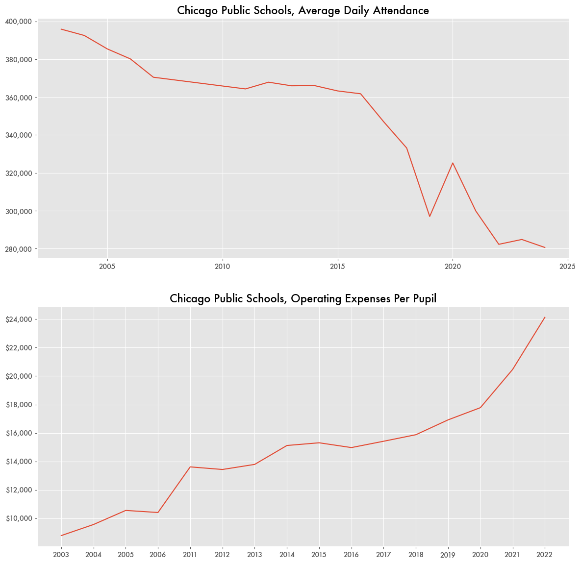 It’s an important point to make since Chicago’s population has been in stark decline for the last few decades. As families leave the city, the school system has been hemorrhaging students. Over 100,000 school-age residents left the city since 2010 based on U.S. Census data. Average daily attendance is down over 100,000 according to NCES data, possibly indicating some are leaving for private schools.