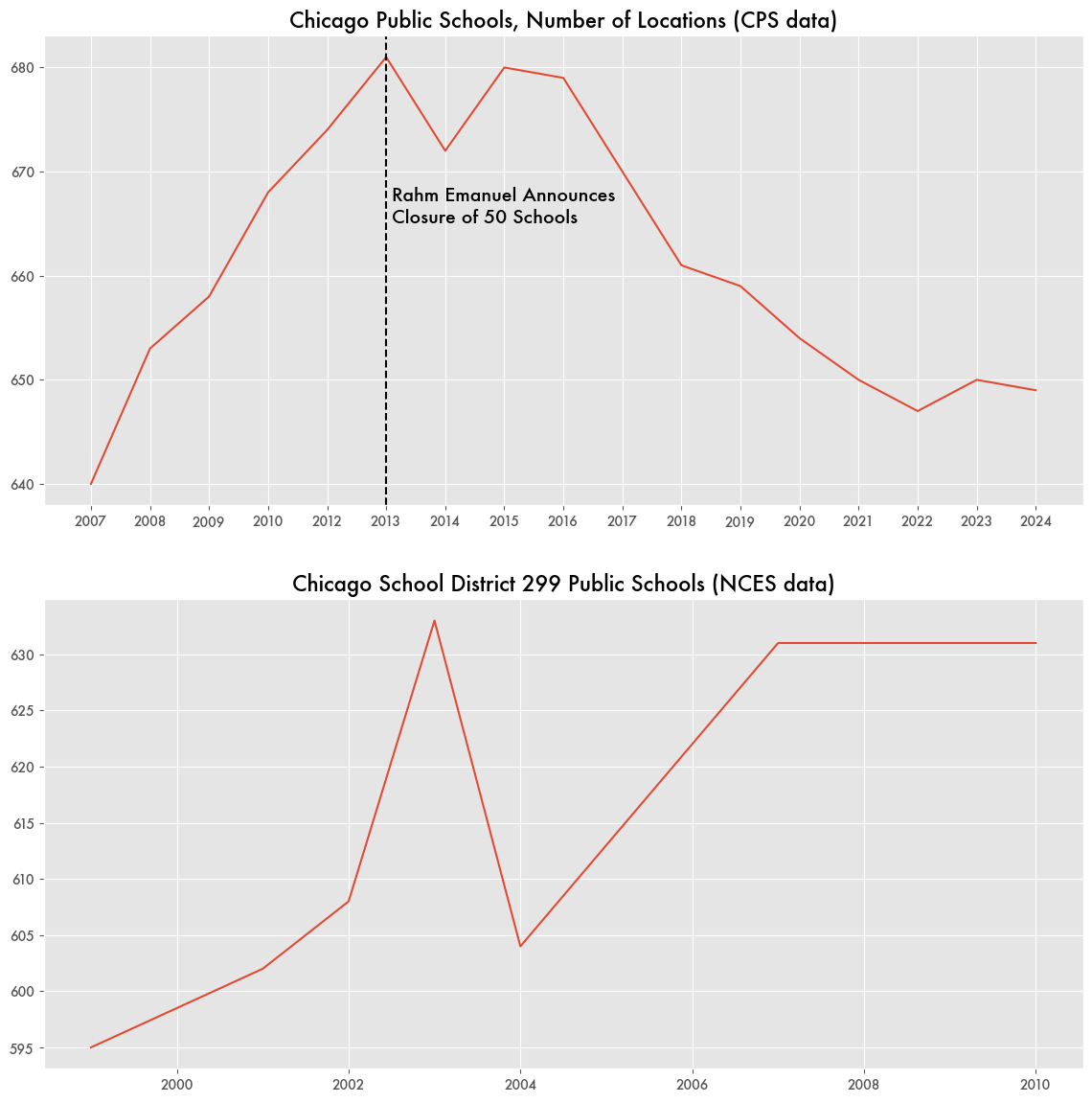 But data from Chicago Public Schools shows the total number of locations only declining by 30 since 2013, and it happened slowly, not all in one year. And the number of closings was relatively minimal considering that there was a growth of 41 schools in the six years prior.