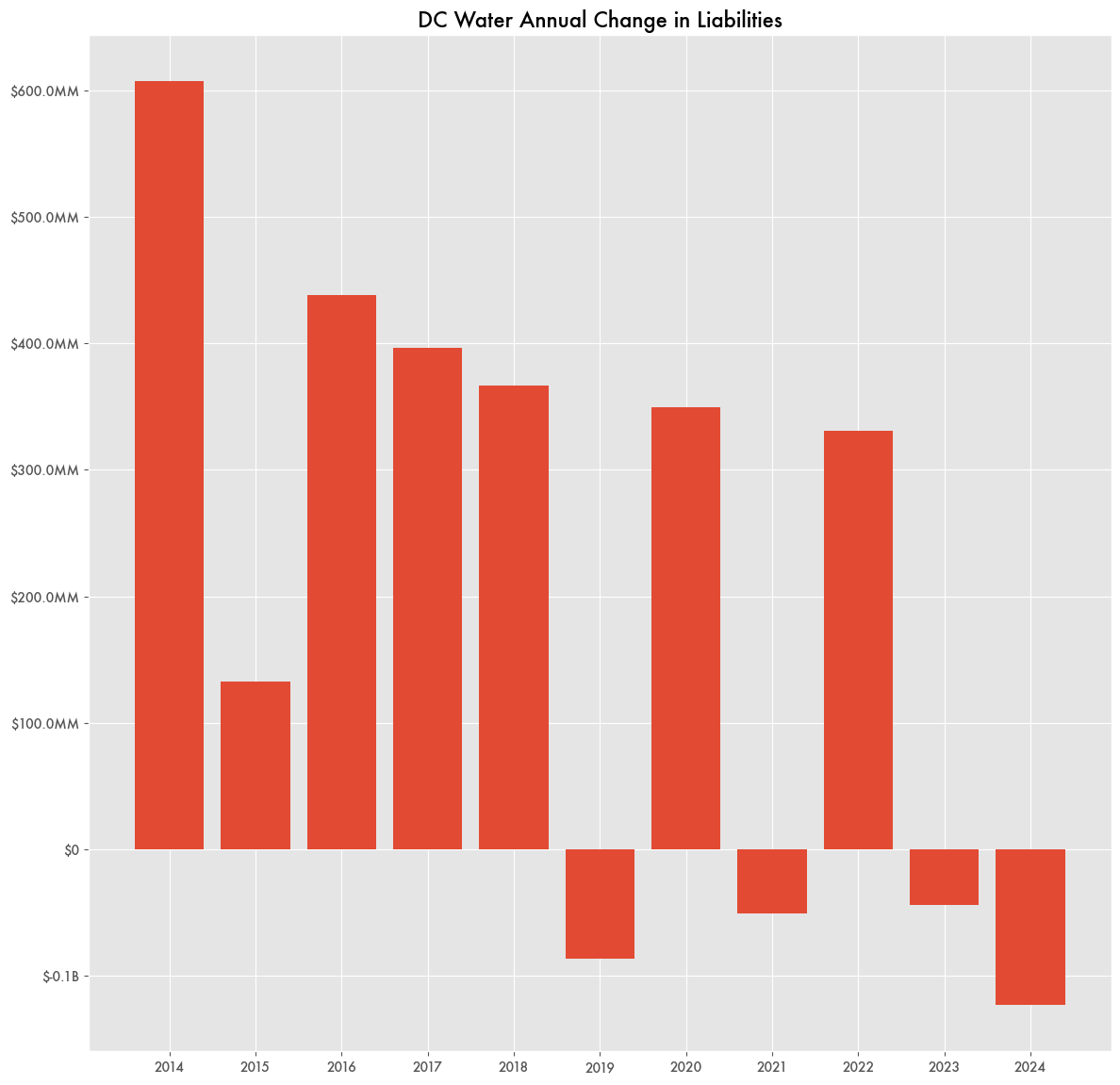 Even with the high user fees, DC Water has made little headway in paying off the debt. The most they paid down was in 2024 when liabilities decreased by $123 million—slightly less than their annual interest payments for the year. Since 2014, they have taken on about $200 million in debt a year.