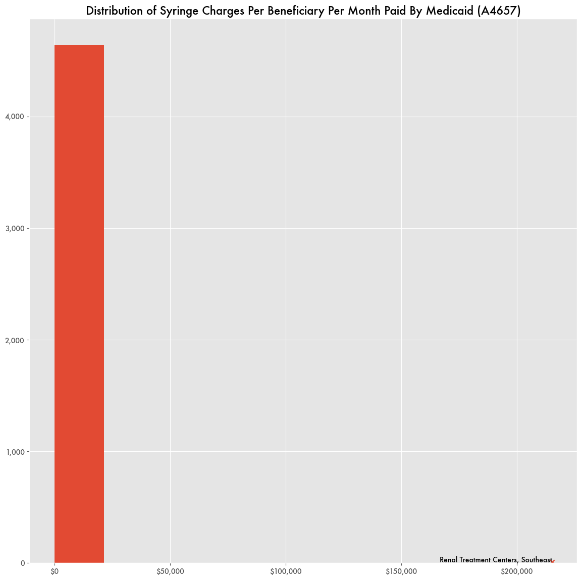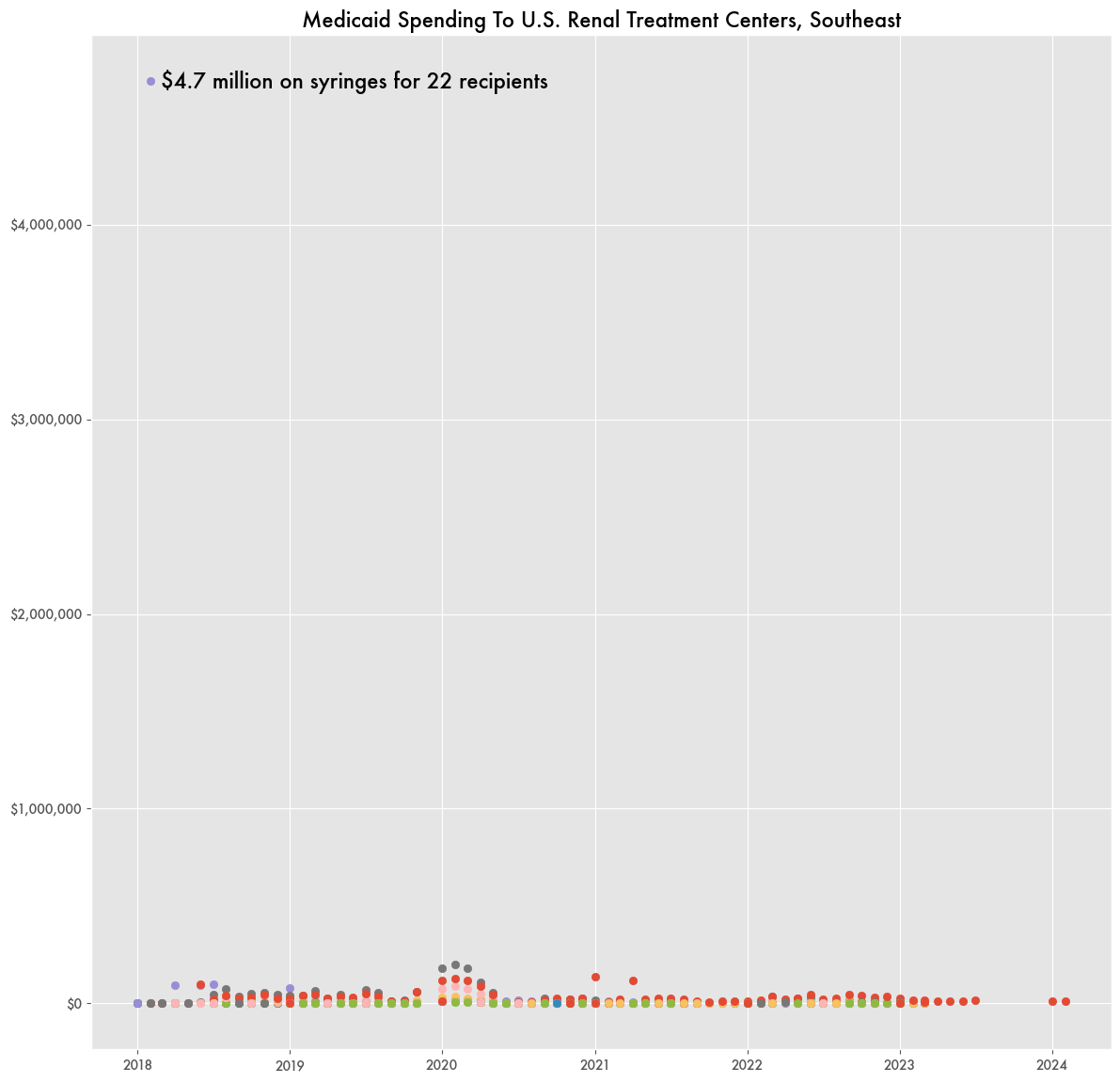 Yet in 2018 Medicaid gave U.S. Renal Treatment Centers, Southeast over $4.7 million for syringes for 22 recipients—an average spend of $215,314 per recipient.