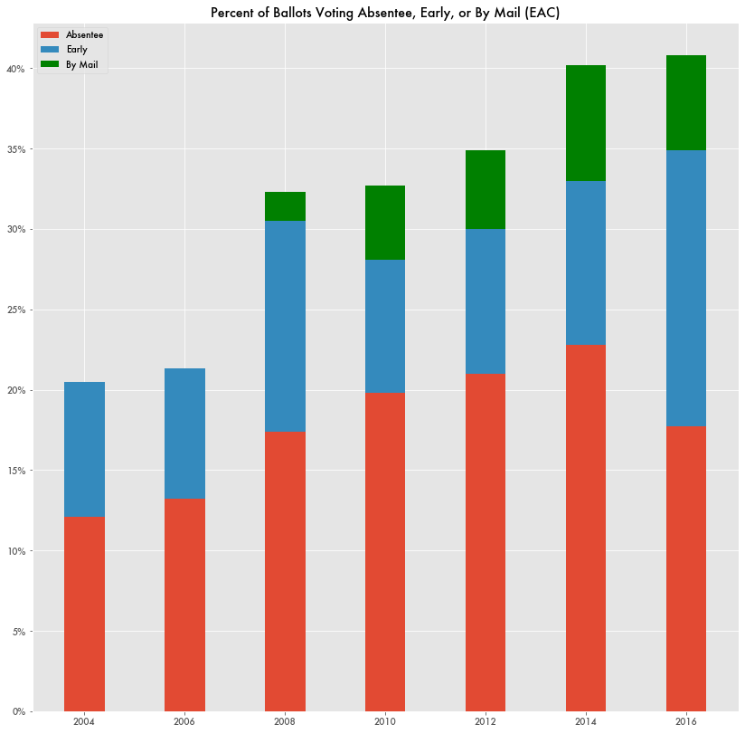 Absentee voting—specifically requesting a mail-in ballot because a voter will be absent on election day—has been on a fast incline since 2004 without the pandemic, according to a 2016 report by the U.S. Election Assistance Commission (EAC). In 2016, the absentee rate was over 23 percent—over double what it was 12 years prior.