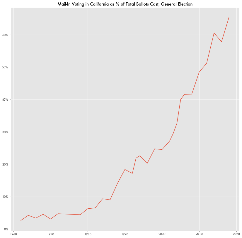 In California, the prevalence of mail-in voting has been on an exponential path since the 1990s. The mail-in voting rate doubled from 32.61 in 2004 to 65.31 percent in 2018.