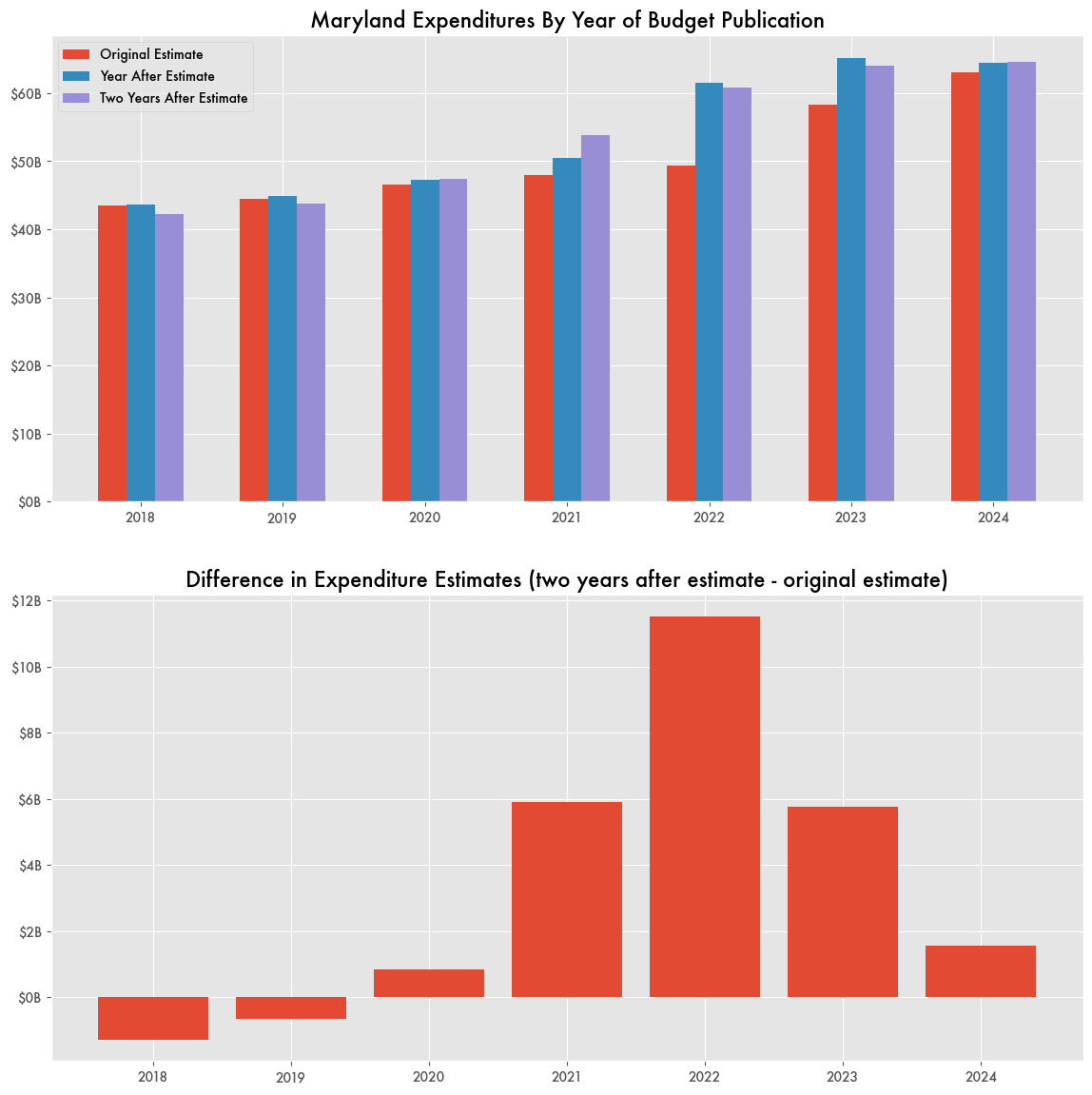 For 2021 through 2023, total state expenditures would be revised upwards by between $5.8 billion to $11.5 billion a year. What was originally $49 billion in spending for 2022 eventually landed at $61 billion based on budget documents published in 2025.