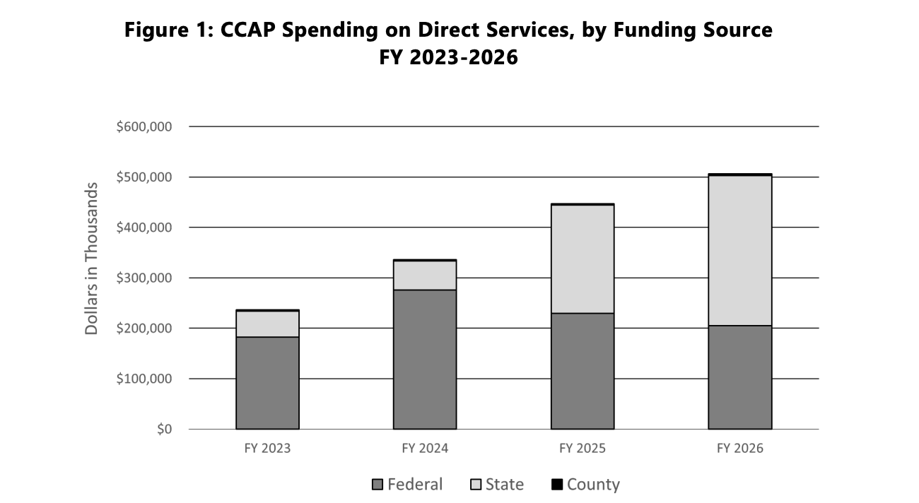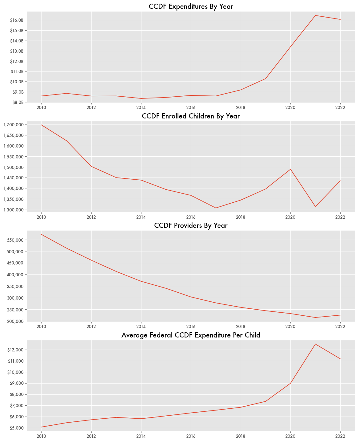 While the state moved away from funding daycares since 2019, the federal government took up the burden of daycare funding through the Child Care and Development Fund (CCDF) by HHS’s Administration for Children and Families (ACF). CCDF expenditures have effectively doubled since 2018 because of the reauthorization of the Child Care and Development Block Grant (CCDBG) Act of 2014.