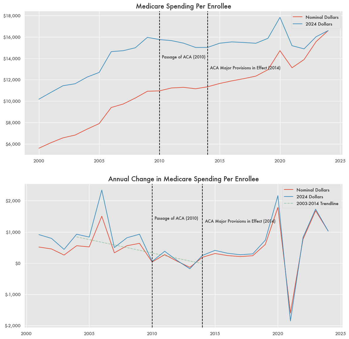 Any declining growth in Medicare from the ACA’s passage in 2010 or otherwise came to a halt by 2014 when most of the other ACA provisions were in effect. Since 2014, spending increased significantly leading up to the pandemic and then again since 2023.