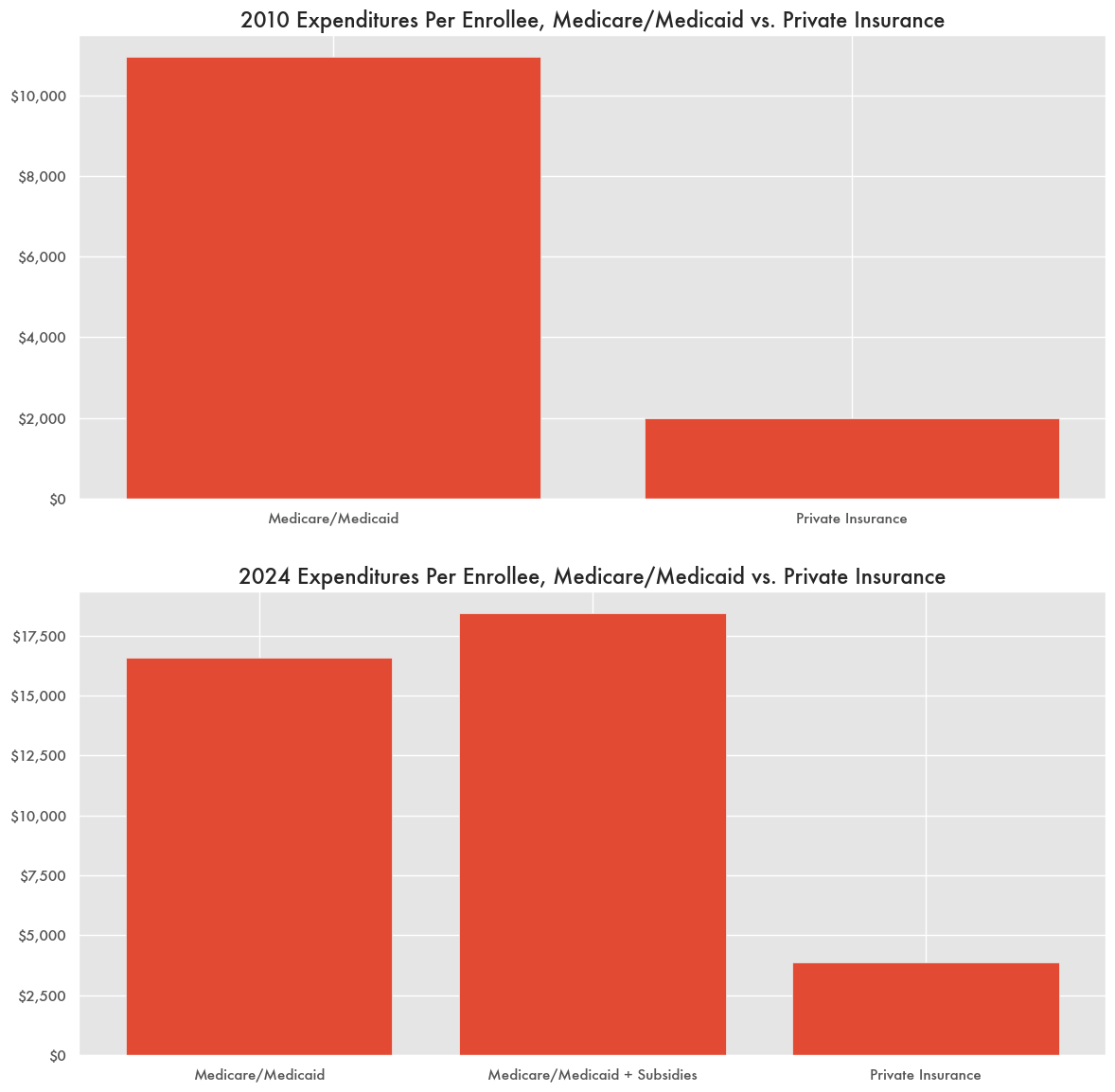 Those are not paid through Medicare and Medicaid, but come directly out of the Treasury’s coffers. If subsidies are included, federal government spending per enrollee is currently almost five times that of private insurance.