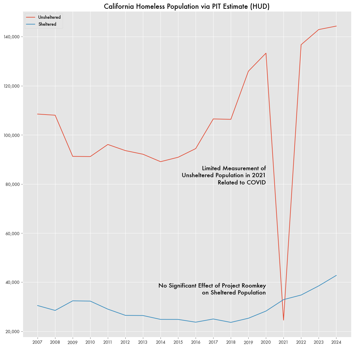 When the pandemic hit in 2020, COVID restrictions hampered the survey out of concern for public health. As a result, data on total unsheltered homeless population in 2021 would show an enormous drop, almost 200,000, from a lack of reporting.