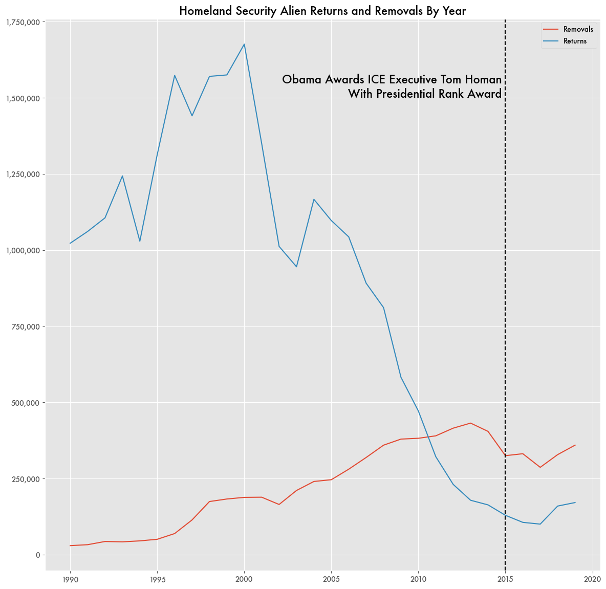 According to Department of Homeland Security (DHS) data, DHS returned 1.7 million to their home countries in 2000. Fifteen years later in 2015 it was less than one-tenth that amount—130,000. While that trend pre-dated Homan and Obama’s tenure, the number of removals—returns based on an order of removal, which had been rising throughout the decade, started distinctly declining around 2012 right before Homan was nominated for his post at ICE in 2013 and would be 25 percent lower by 2015.