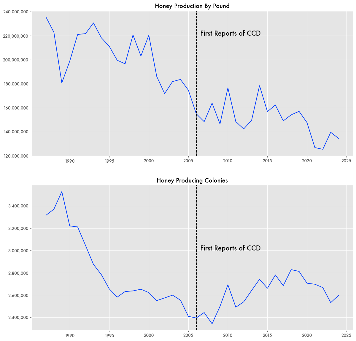 Honey production and honey producing bee colonies were in steep decline for years prior to the first recognition of CCD and actually stabilized after it was recognized.