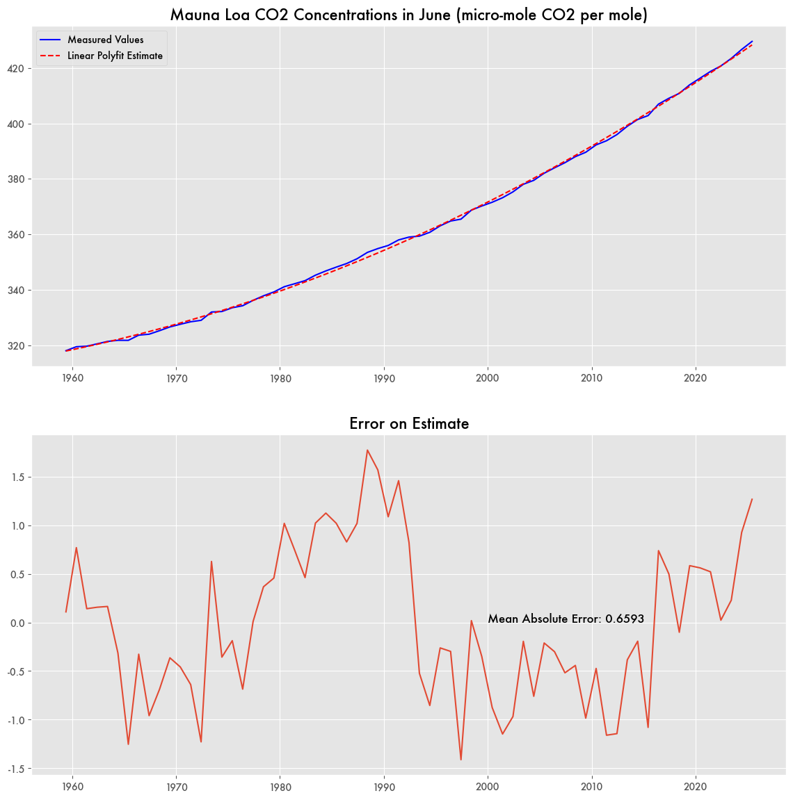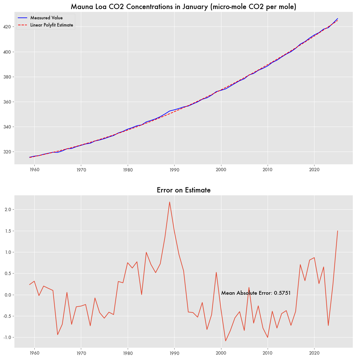 But no matter what, Mauna Loa shows such a predictable measurement that a two-dimensional polynomial can accurately represent values within two-tenths of a percent. It increases year over year whether or not volcanoes erupt in front of it, oil consumption collapses, or industrial output comes to a halt.