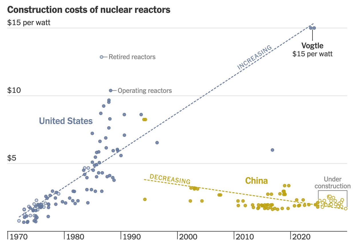 That also includes the previous Vogtle reactor units 1 & 2, completed in 1987 and 1989 respectively. Originally expected to cost $660 million, they ended up at $8.87 billion. In 2024 dollars, that works out to be around $24 billion for 2.236 megawatts of capacity—or $10.7 per watt—just under Vogtle 3 & 4’s $12 per watt.