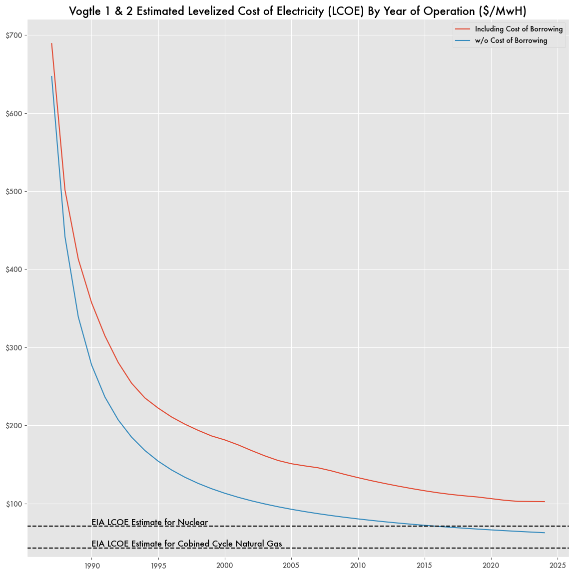 Despite the excess upfront costs, the original reactors produce a hefty 19 terawatt-hours of electricity for the state a year—about 15 percent of the Georgia’s total energy consumption. Based on average Georgia electricity rates, they were annually generating somewhere between $2.5 and $3.2 billion (in 2024 dollars) worth of electricity for over 30 years.