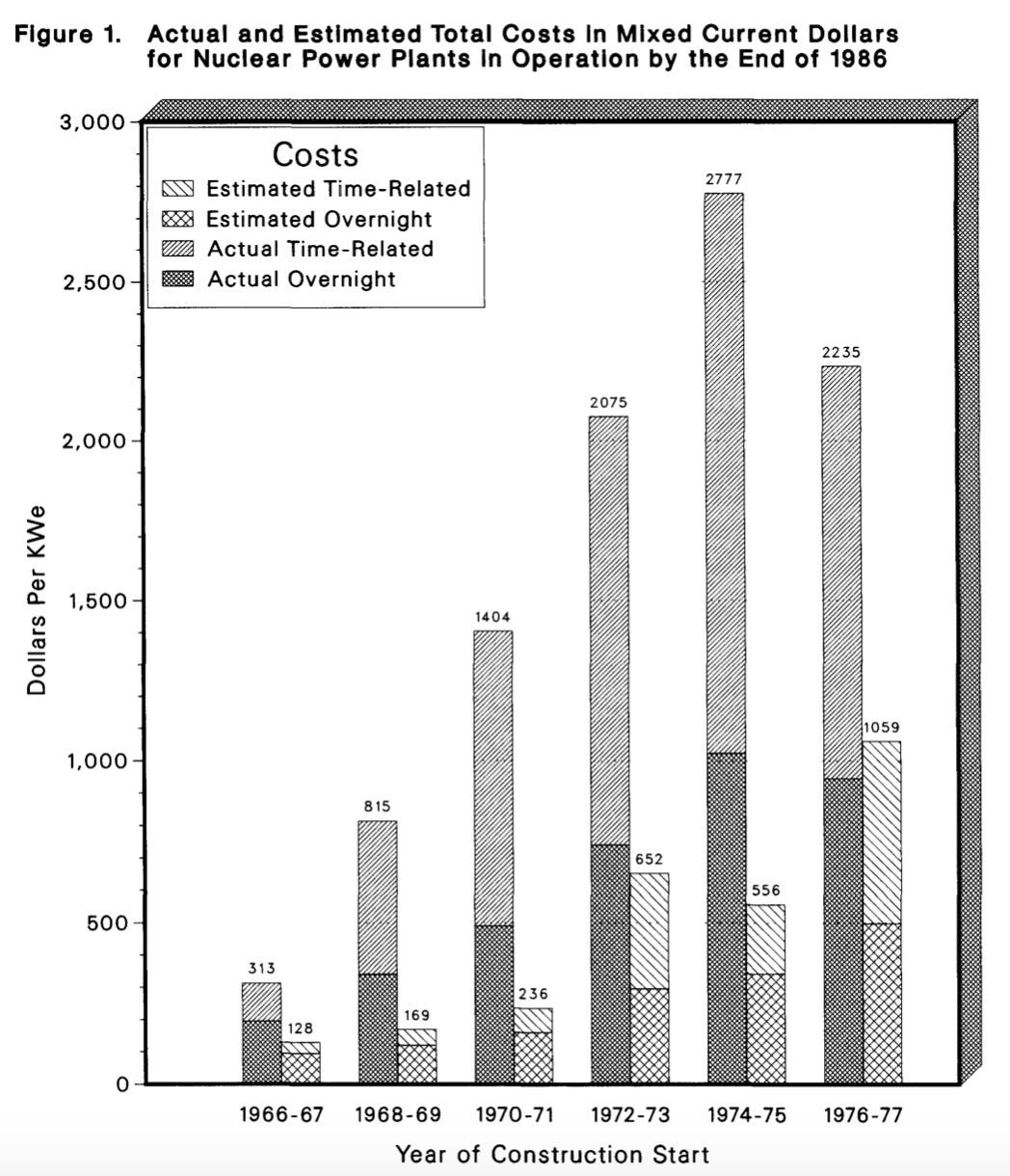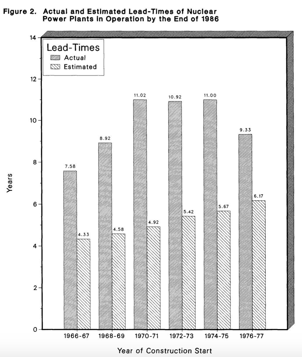 A 1986 report from the Energy Information Administration (EIA) shows how on average most reactor projects regularly went beyond their estimated completion times as construction demands and updated regulations forced changes midway through even as nuclear technology became well established.