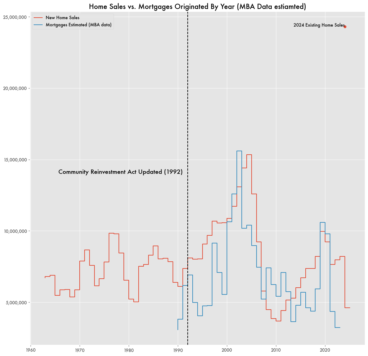 Based on Mortgage Bankers Association (MBA) data for total mortgage value and average home price per year from the U.S. Census, the total number of mortgages in the 1990s might have been much lower than new home sales. In 1996, there were 4.9 million fewer mortgages than new home sales.