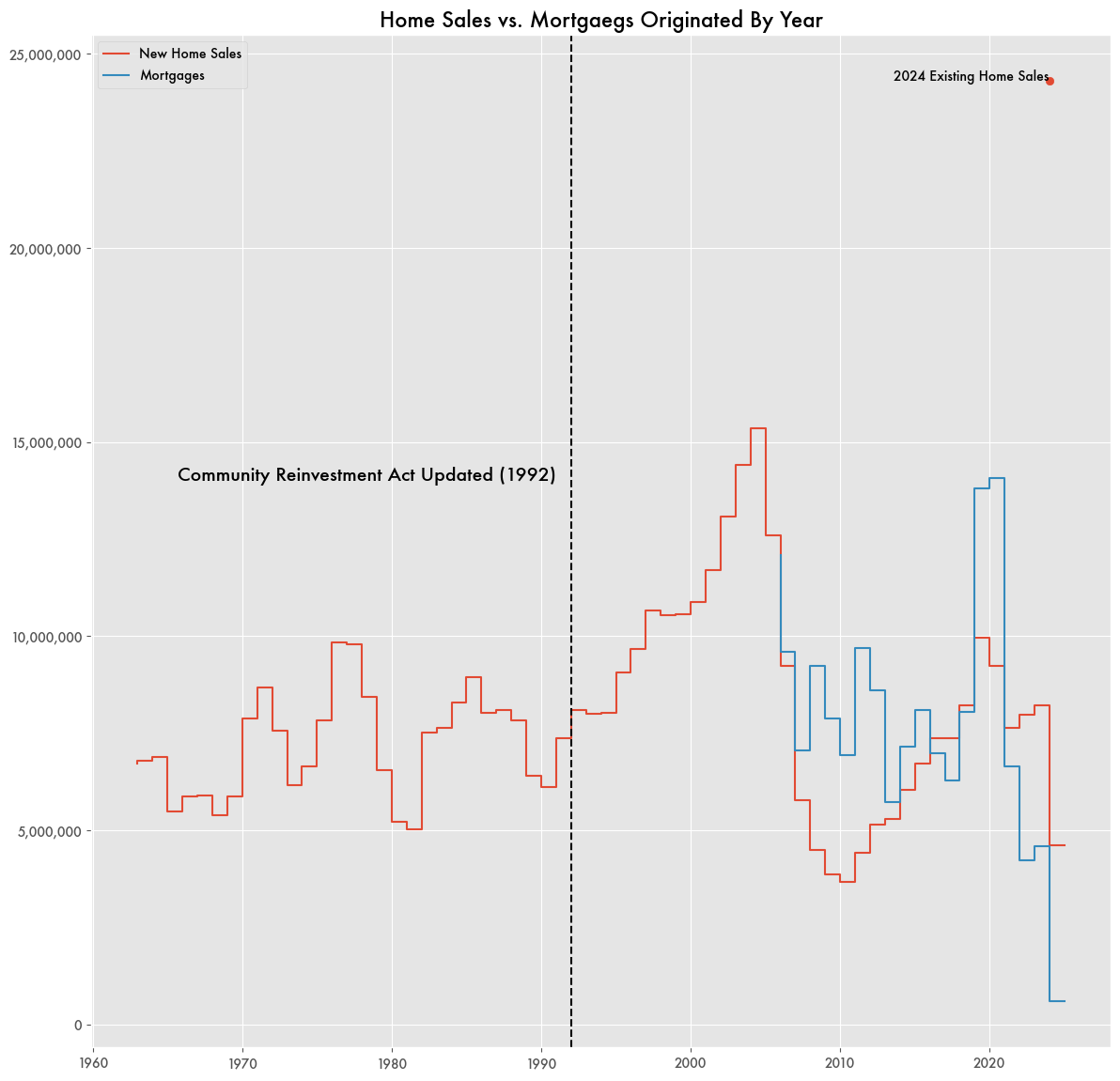 Home sales went higher and higher throughout the 1990s following changes to housing policy under the Clinton administration. It wasn’t until the 2000s that mortgage origination numbers quickly caught up with new home sales. In 2002 was one of the few times that mortgages outpaced new home sales—by approximately 8 million—but again, this doesn’t include existing home sales.